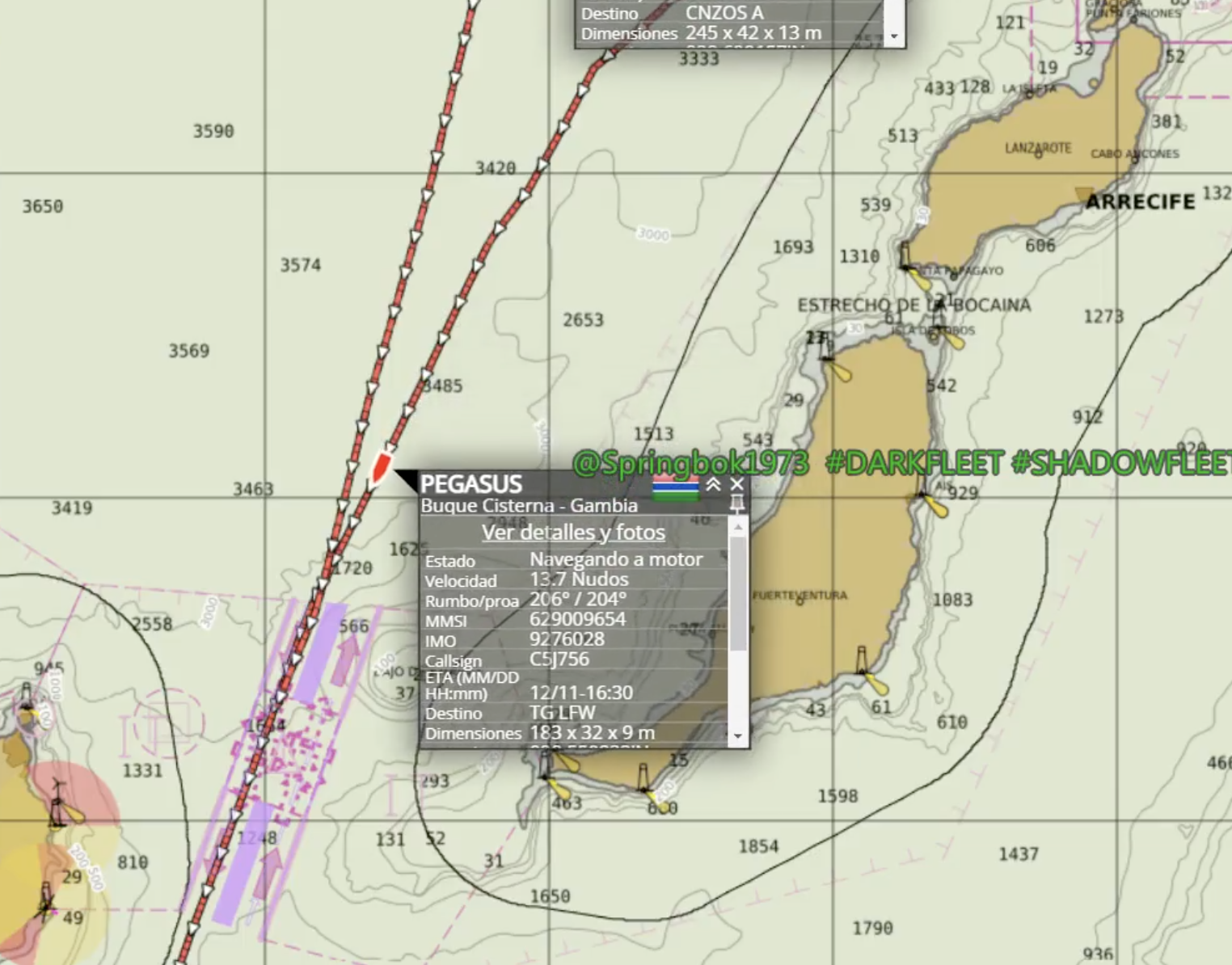 Durante el día de ayer pasaba entre Fuerteventura y Gran Canaria un buque petrolero tanker de la Dark Fleet o flota fantasma que representa un peligro manifiesto para las costas canarias por su antigüedad y por la falta de control del operador.