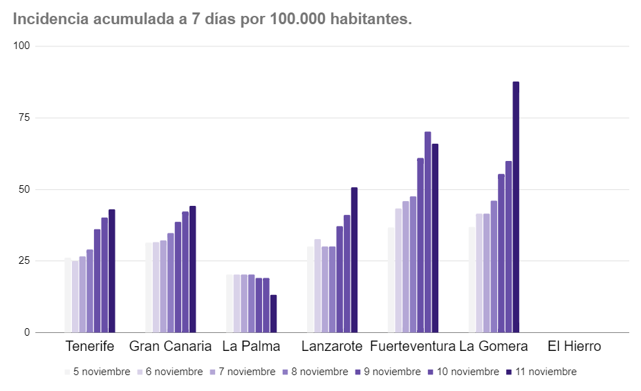 La Incidencia Acumulada a los 7 días en Canarias se sitúa en 44,44 casos por cada 100.000 habitantes y a los 14 días en los 70,54 casos por 100.000 habitantes.