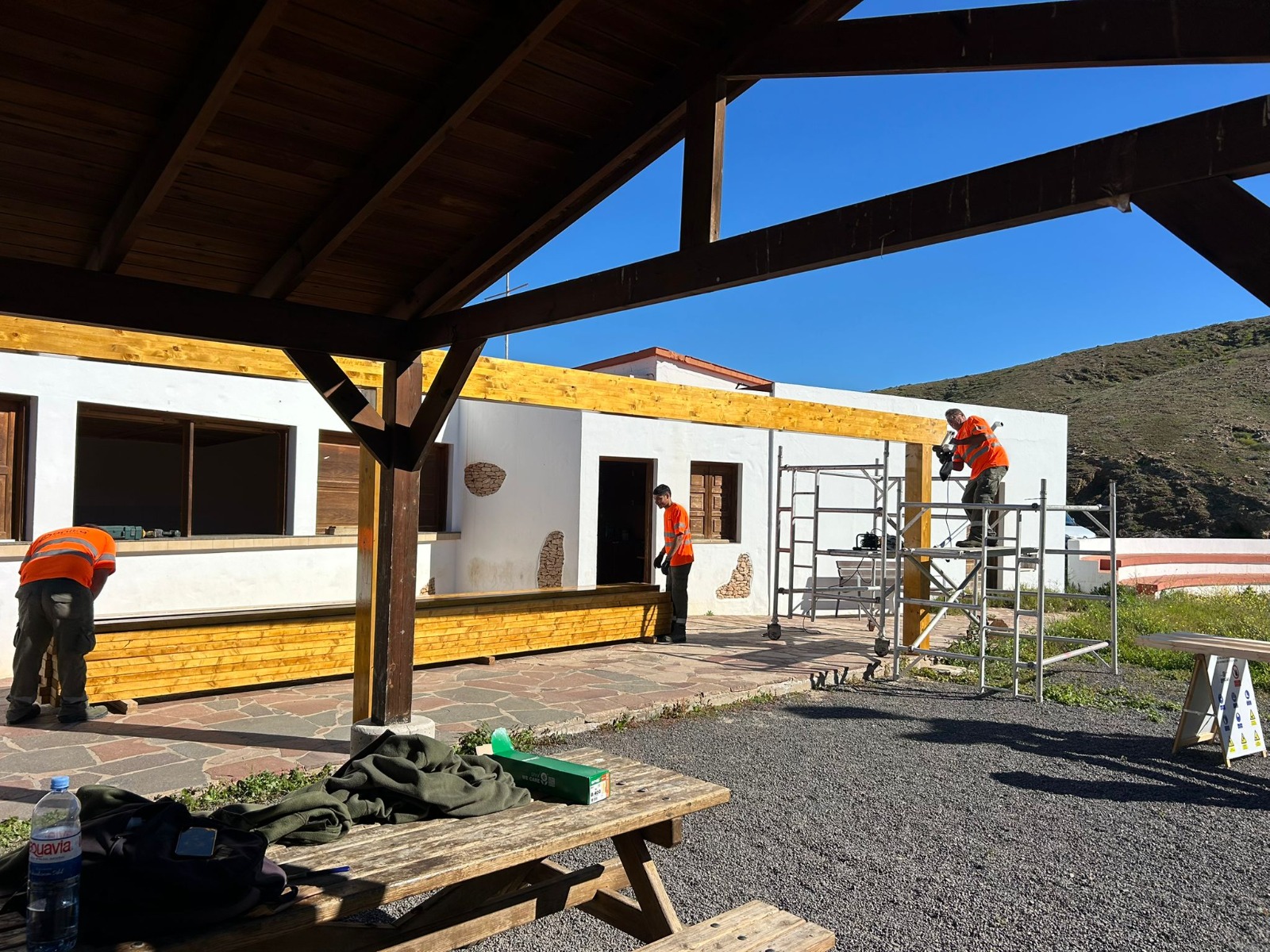 El material de madera de las pérgolas se almacenó en la Base de Operaciones Sur de Gesplan, en El Cuchillete, donde los operarios aplicaron varias capas de protección para garantizar su durabilidad y su resistencia a la erosión de los elementos.