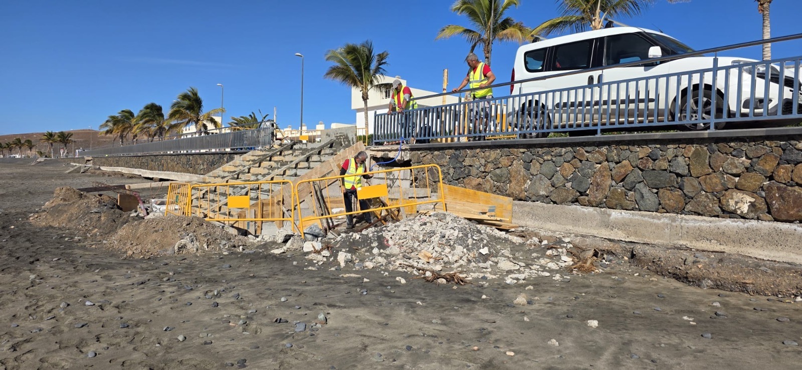 Últimos trabajos para que la playa de Tarajalejo recupere su escalera y estrene una barandilla de seguridad. El Cabildo de Fuerteventura, a través del Servicio de Obras y Maquinaria, y atendiendo la petición del Ayuntamiento de Tuineje, ya ha procedido a la cimentación armada de la escalera que destruyó un temporal y que dará acceso a la arena desde el paseo, que en esa zona se emplaza a varios metros de altura. Además, la nueva barandilla protegerá a los viandantes del desnivel.